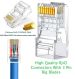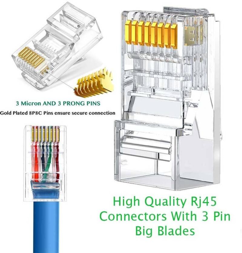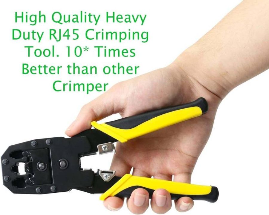 A professional-grade 3-in-1 modular crimping tool for RJ45 and RJ11 with integrated color coding guide, network cable cutter, stripper, and 50 high-quality Cat5e/Cat6 RJ45 connectors—perfect for reliable network installations.