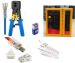 All-in-one cordless crimping kit featuring a heavy-duty lan tester, passthrough crimper, 25 passthrough connectors, and 25 transparent boot caps—ideal for fast and reliable network cable installations.